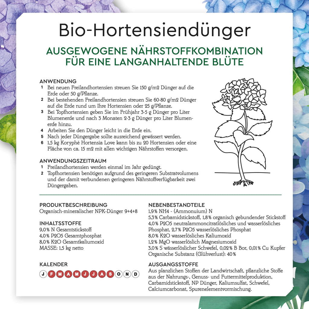 1.5 kg of Koryphé Hortensia Love can supply up to 20 hortensias or an area of about 15 m² with all relevant nutrients.
