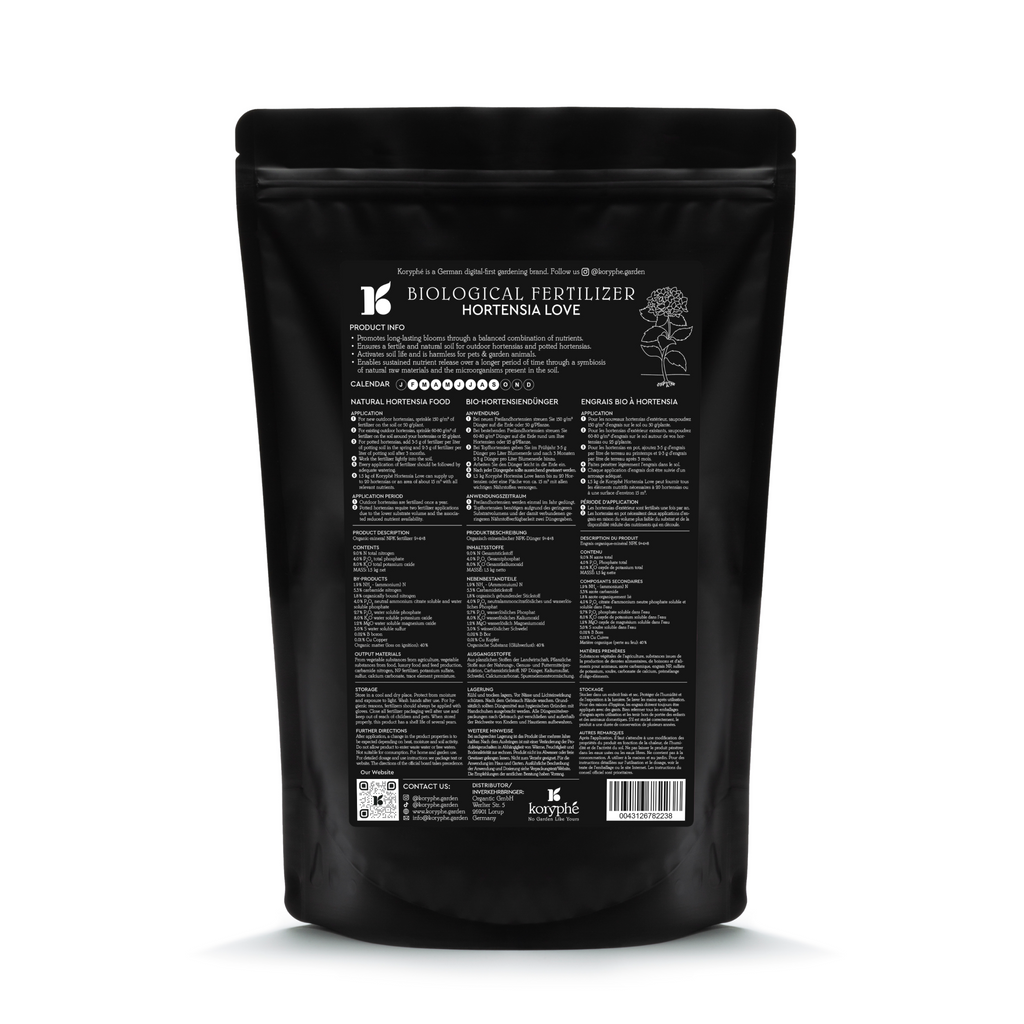 Hortensias are luscious flowers full of surprises, uses and symbolism. You can expect to be rewarded with luxurious foliage and glorious blooms when practicing proper care and feeding. Our Koryphé Hortensia Love fertilizer aims to be your plant's ally and primary option when it comes to nourishing!